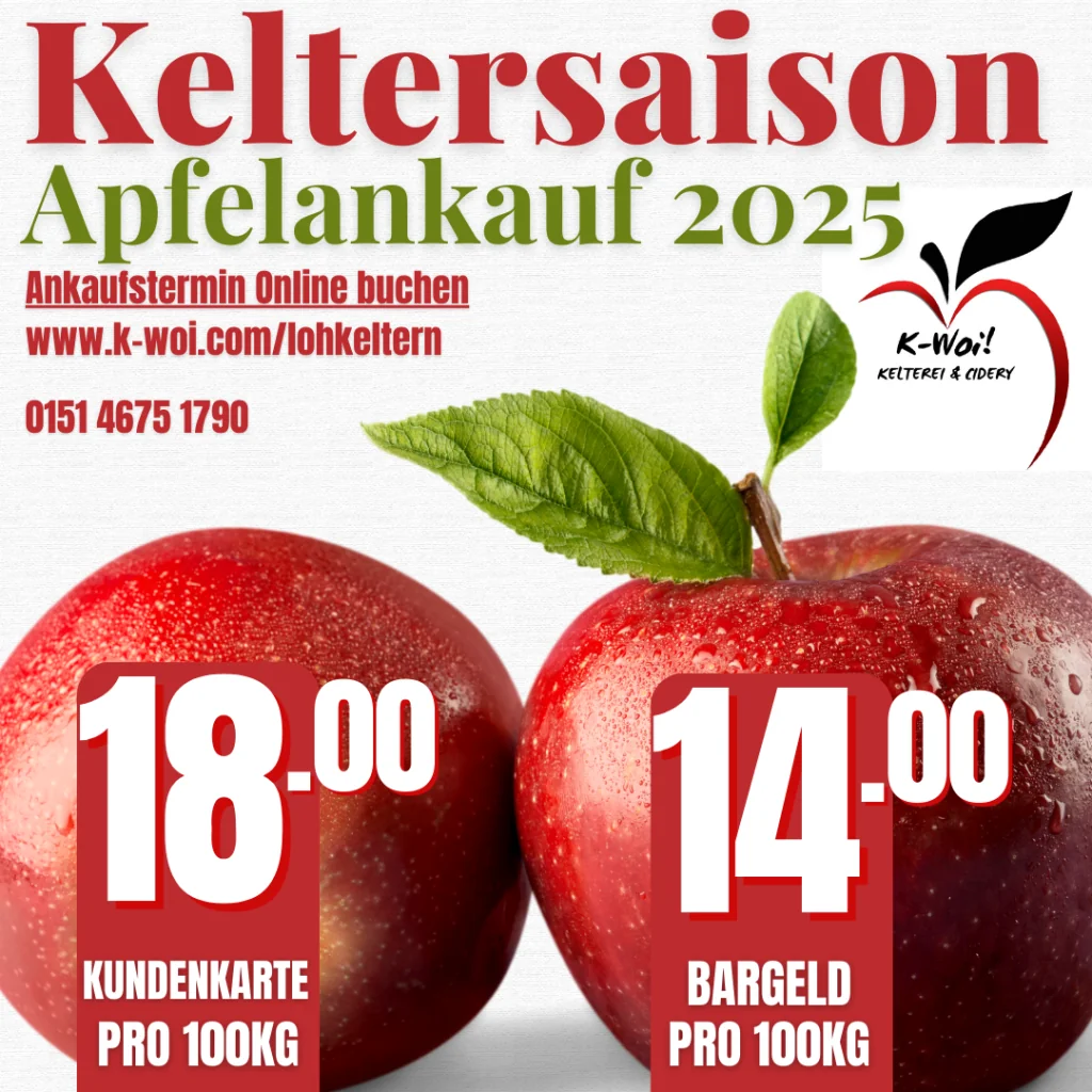 Wichtig: Lohnkeltern – also das Pressen eurer eigenen Äpfel zu Apfelwein oder Apfelsaft – findet nur vom 18. September bis 11. Oktober statt.